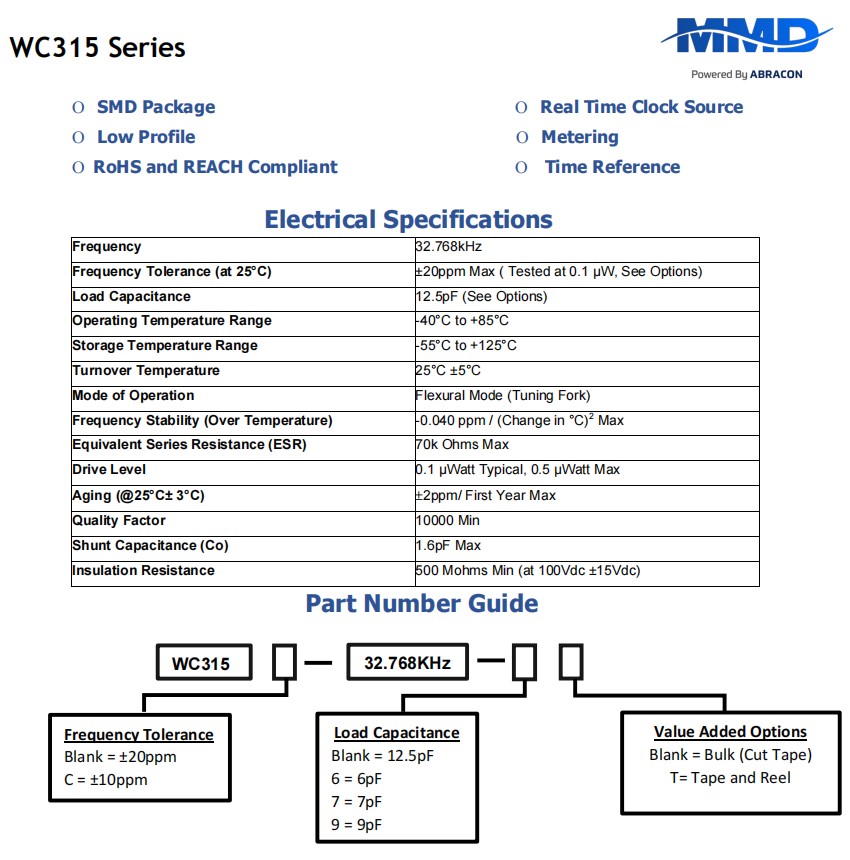 WC315-32.768KHZ-T,WC315,3215mm,Mmdcomp石英晶振,美國進口晶振,Mmdcomp麥迪康晶振,型號:WC315系列,編碼為:WC315-32.768KHZ-T,頻率為:32.768KHz,負載:12.5pF,精度:±20ppm,工作溫度范圍:-40℃至+85℃,小體積晶振尺寸:3.2x1.5x0.9mm,兩腳貼片晶振,無源晶振,3215晶振,石英晶體,SMD晶振,石英晶體諧振器。具有超小型,輕薄型,高性能,高品質(zhì),耐熱及耐環(huán)境特點。應(yīng)用于:移動通訊晶振,鐘表電子晶振,儀器儀表設(shè)備晶振,無線藍牙晶振,平板電腦晶振,智能家居晶振,數(shù)碼電子等應(yīng)用。